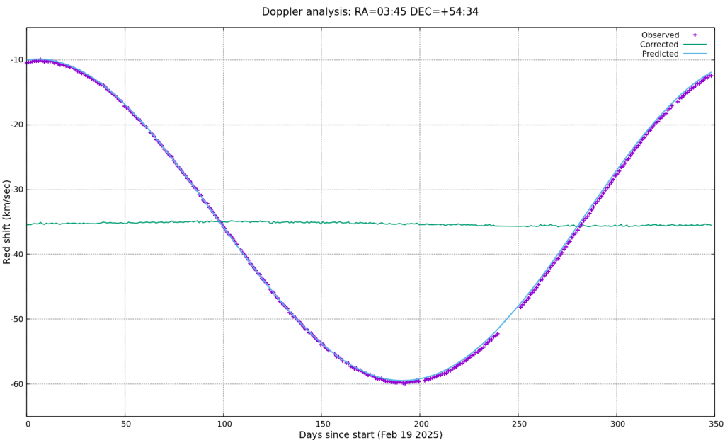 The graph above shows the Doppler shift of the 21 cm radiation from the same spot in the galaxy as a function of the number of days since Feb. 19 of 2025. The roughly sinusoidal nature of the curve reflects the Earth’s approximately circular orbit around the Sun.
